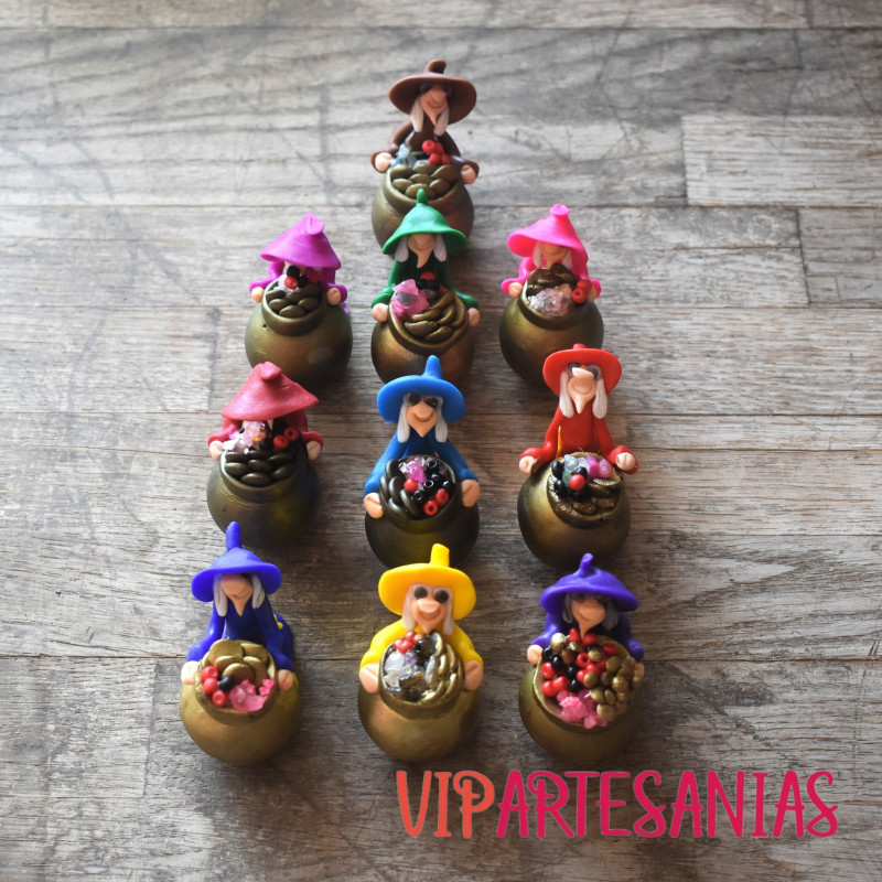 Las Brujitas de la Suerte se elaboran a mano utilizando resina, por lo que cada una es diferente. Cada Brujita tiene un propósito esotérico diferente. Vienen en pack individual con su respectiva carta informativa y su propósito. La Brujita se selecciona al azar, en el caso de pedir varias unidades se hará un mix en función de la disponibilidad.
