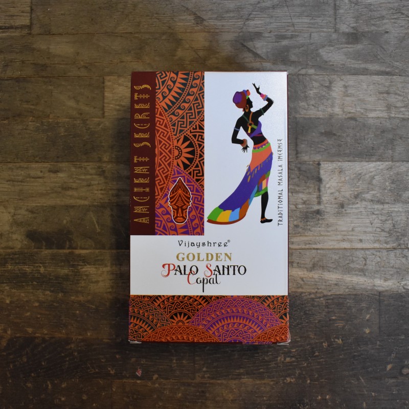 Incienso Golden, fragancia PALO SANTO COPAL, calidad masala. Este conocido incienso tiene como ingredientes especiales la PLUMERIA, conocido en occidente como el ingrediente frangipani (amapola). Esta especialmente mezclado y formulado con una resina semi-liquida extraída del árbol Ailanthus Malabarica que le da su inconfundible color crema y textura húmeda.