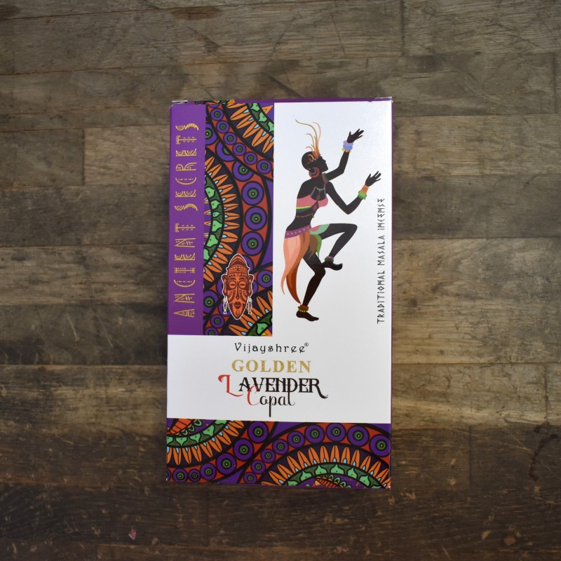 Incienso Golden, fragancia LAVANDA COPAL, calidad masala. Este conocido incienso tiene como ingredientes especiales la PLUMERIA, conocido en occidente como el ingrediente frangipani (amapola). Esta especialmente mezclado y formulado con una resina semi-liquida extraída del árbol Ailanthus Malabarica que le da su inconfundible color crema y textura húmeda.