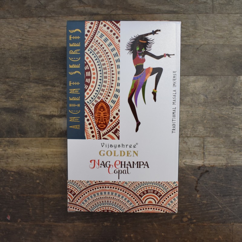 Incienso Golden, fragancia NAG CHAMPA COPAL, calidad masala. Este conocido incienso tiene como ingredientes especiales la PLUMERIA, conocido en occidente como el ingrediente frangipani (amapola). Esta especialmente mezclado y formulado con una resina semi-liquida extraída del árbol Ailanthus Malabarica que le da su inconfundible color crema y textura húmeda.