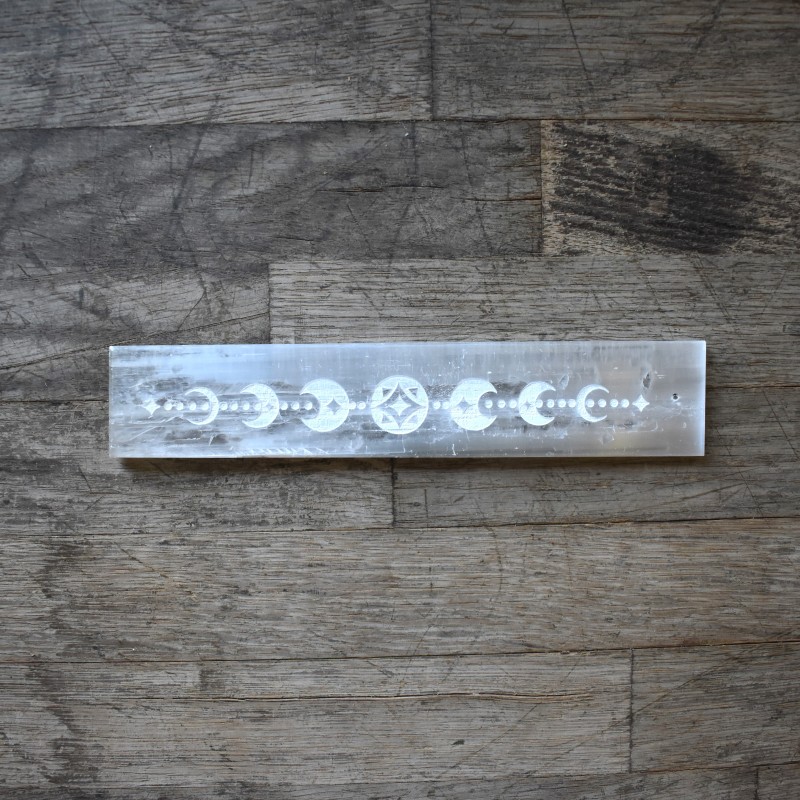Precioso porta incienso artesanal elaborado en selenita con motivo de los Wicca, ideal para utilizar con varillas de inciensos y así aumentar su poder.