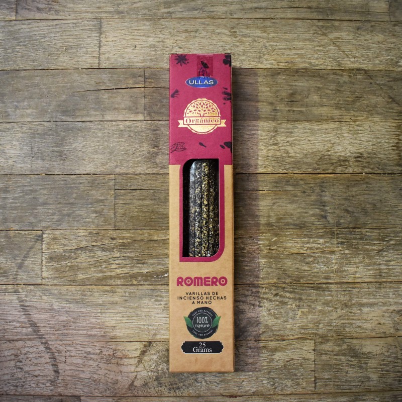 Estas varillas de incienso están elaborados con resinas orgánicas de diferentes procedencias y enriquecidas con sus aceites esenciales naturales. Su fragancia favorece la relajación y meditación como práctica diaria, a la vez que llena el ambiente de un aroma profundamente embriagador. Estas mezclas están hechas según la antigua práctica de las culturas mayas e incas de quemar inciensos en sus rituales. Este incienso orgánico posee un exquisita fragancia a Romero.